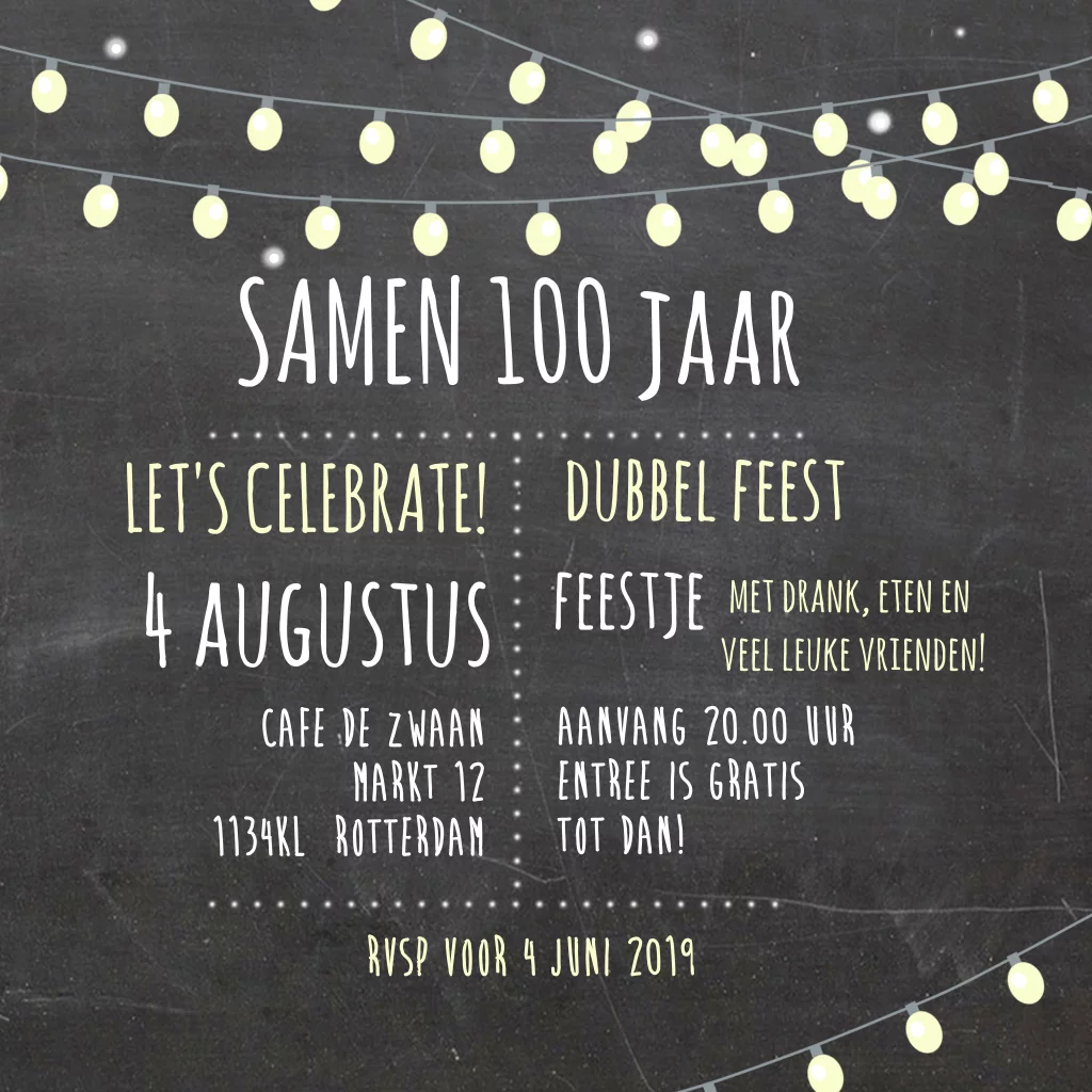 Moderne uitnodiging samen 100 jaar verjaardagfeest krijtbord met slinger van lampjes vierkant. (3194)