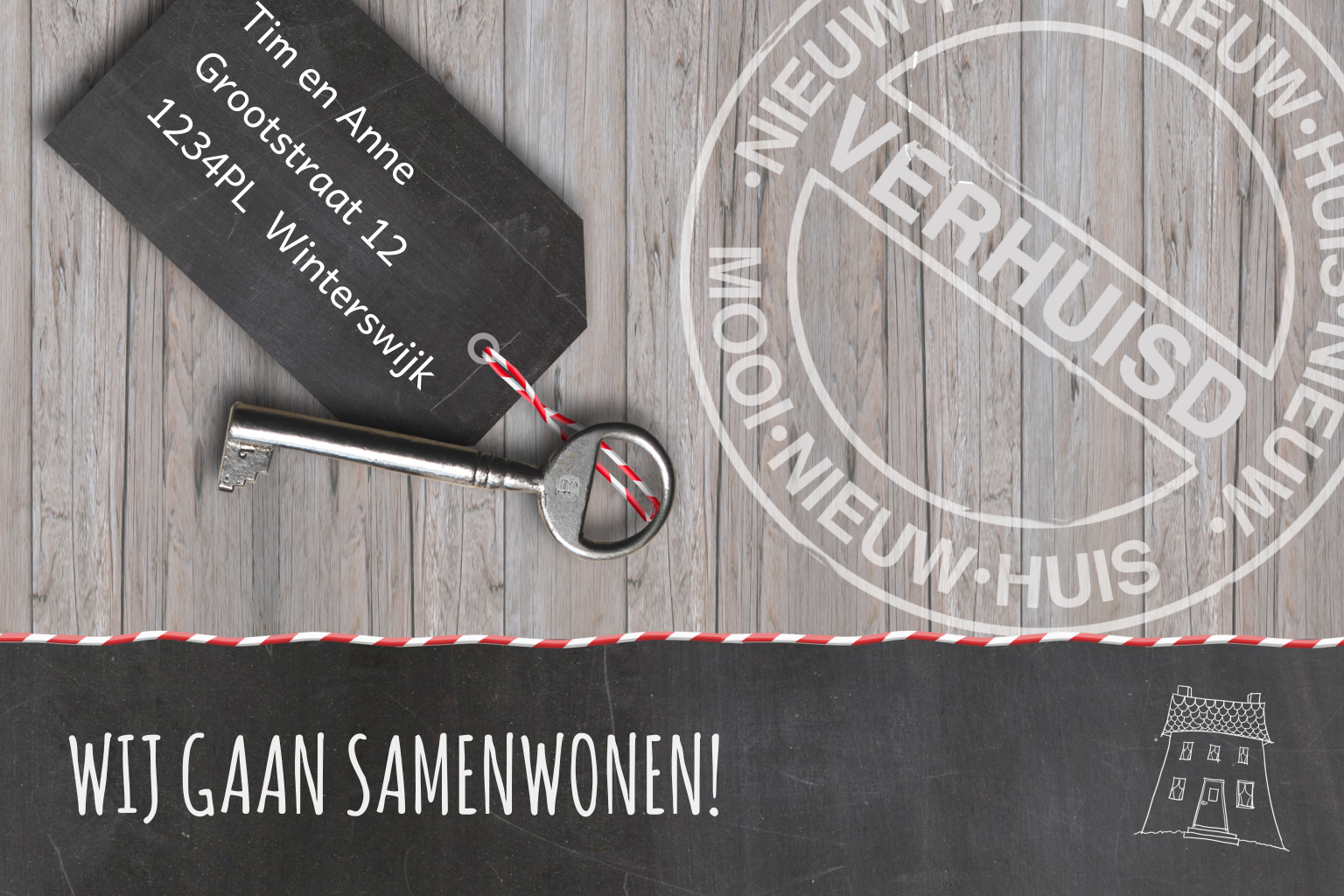 Trendy hippe samenwonen verhuiskaart in krijtbord look. Met houten planken. (2160)