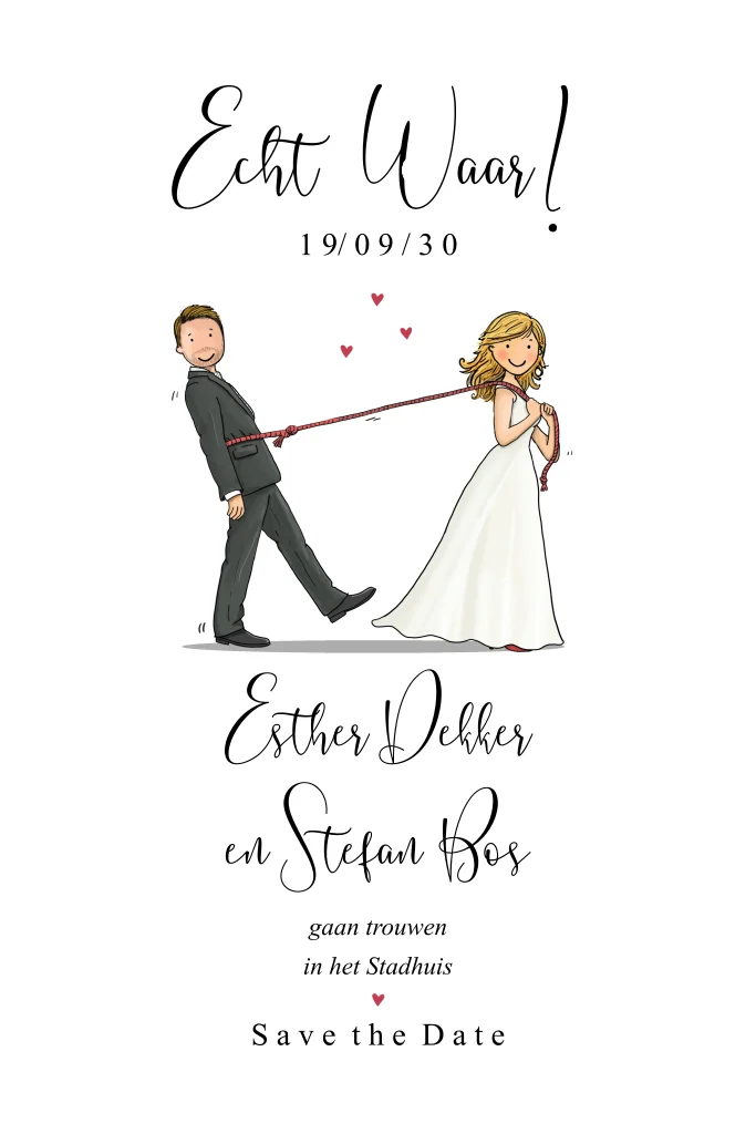 Save the date kaart bruidspaar met touw. (22732) Willen jullie de tekening aangepast hebben zodat het meer op jullie lijkt? Vaak is dat mogelijk, neem daarvoor contact met ons op.