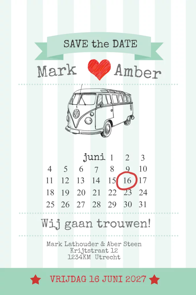 Super hippe save the datekaart in leuke groene tint met banner en vw busje, tekening Anet. (2652)