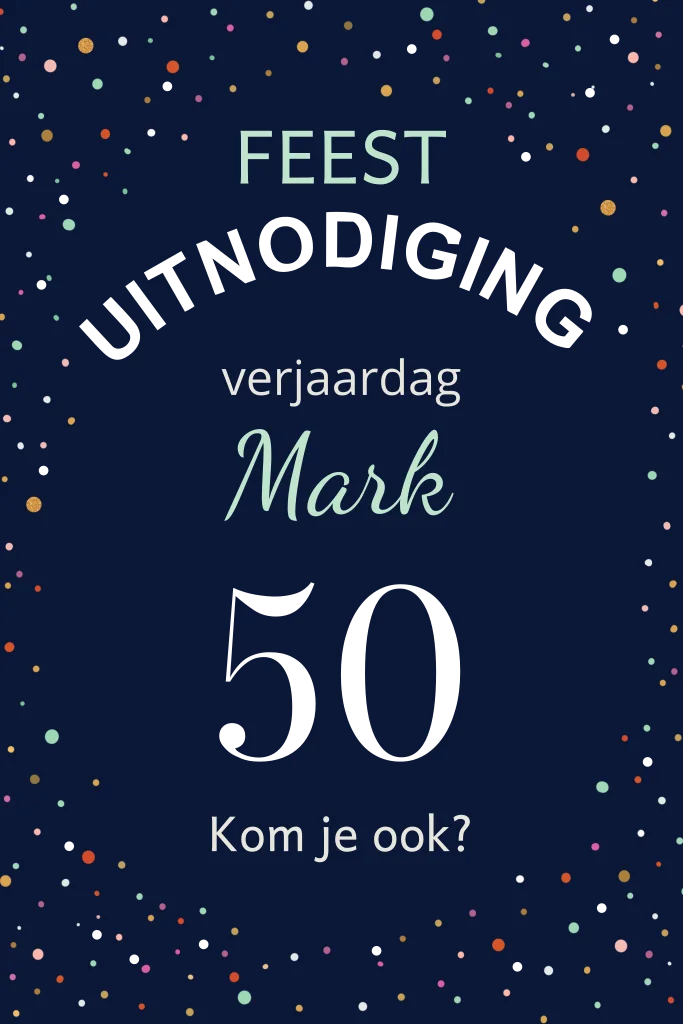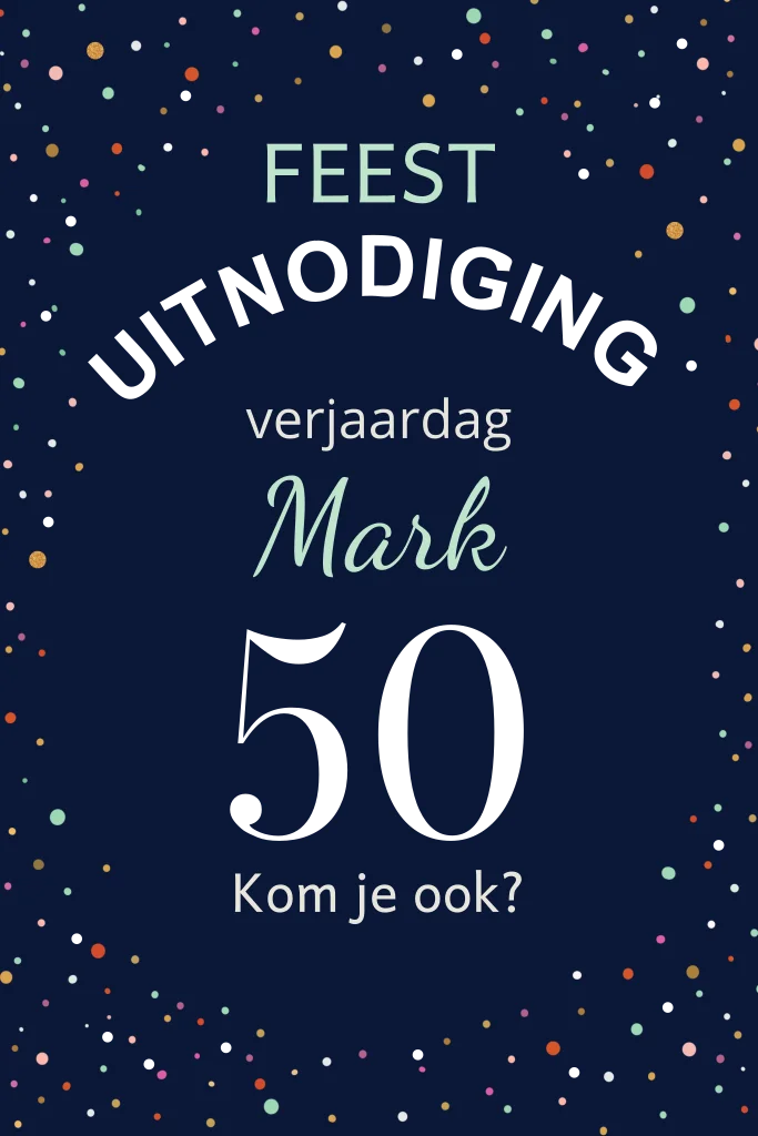 Staande enkele uitnodiging met gekleurde confetti en goudfolie 50 jaar
