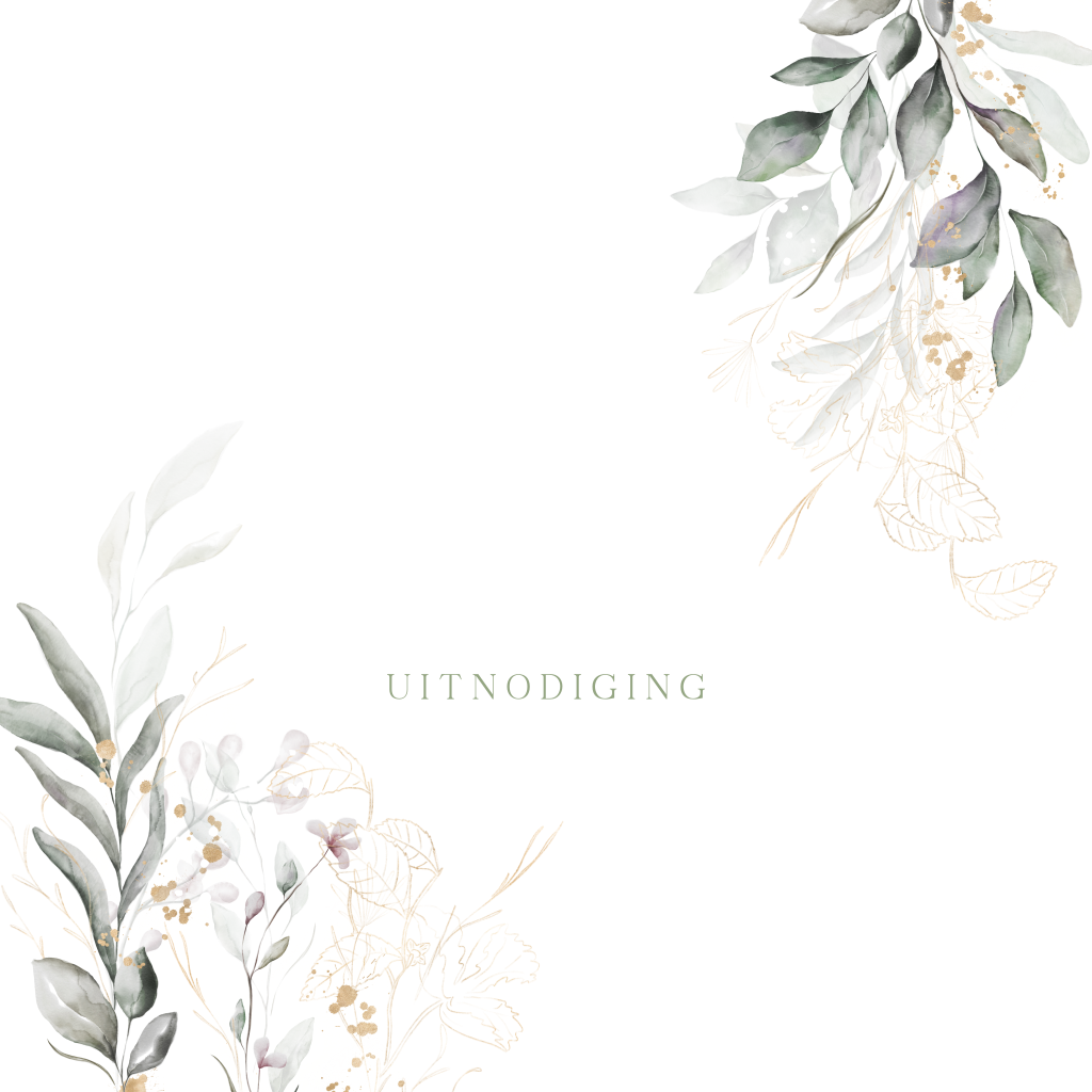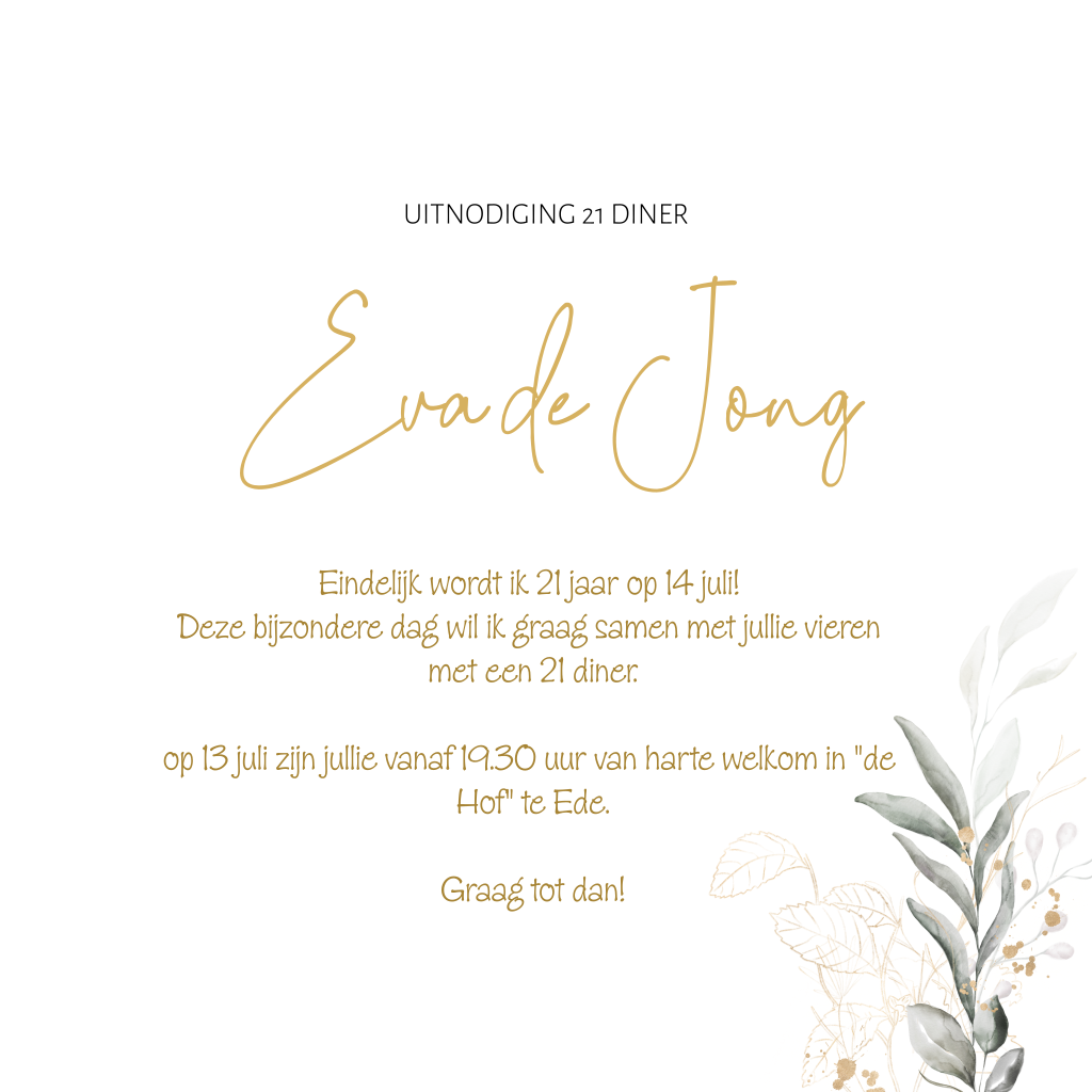 Stijlvolle 21 diner uitnodiging prachtige bloemen en takjes goudfolie