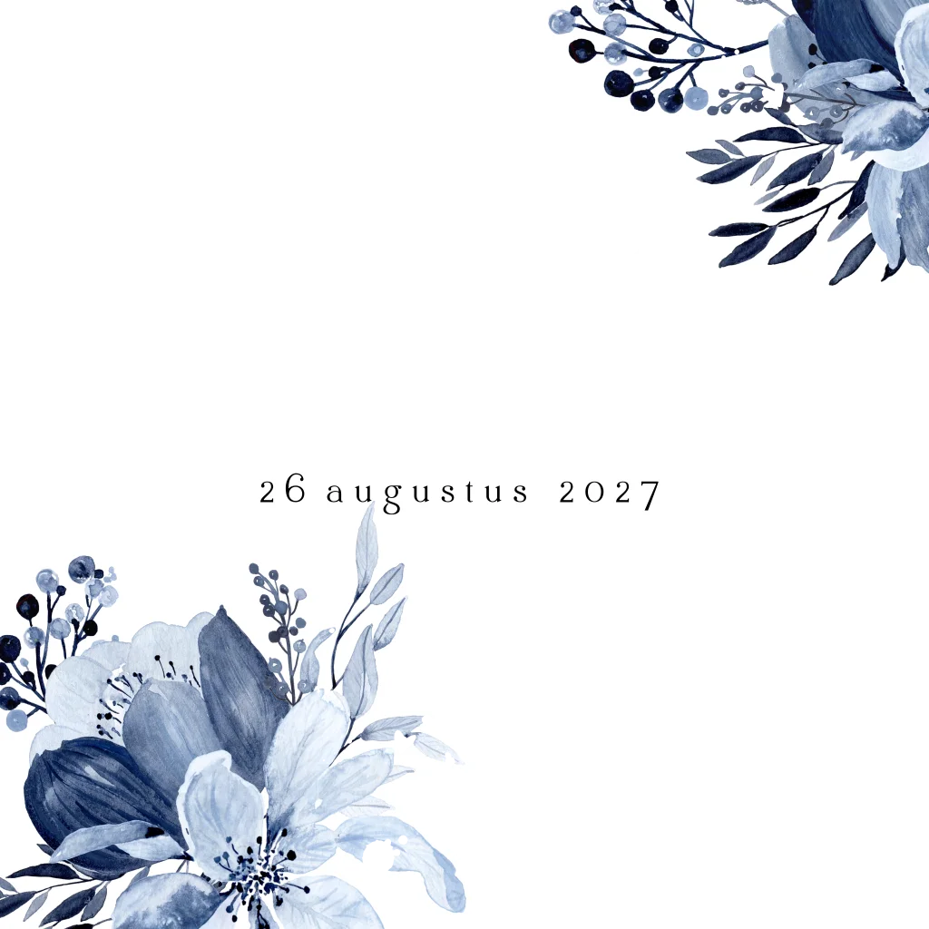 Stijlvolle trendy save the date met bladeren delftsblauw goudfolie