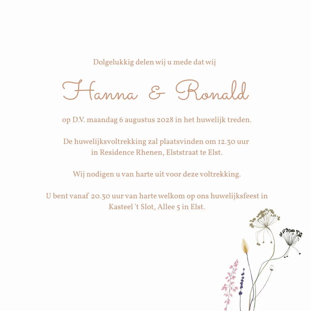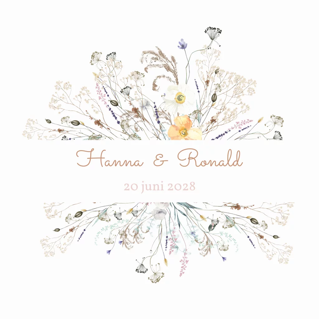 Stijlvolle trendy trouwkaart met getekende droogbloemen. (21868) De lettertypes en tekstkleuren zijn naar wens aan te passen.