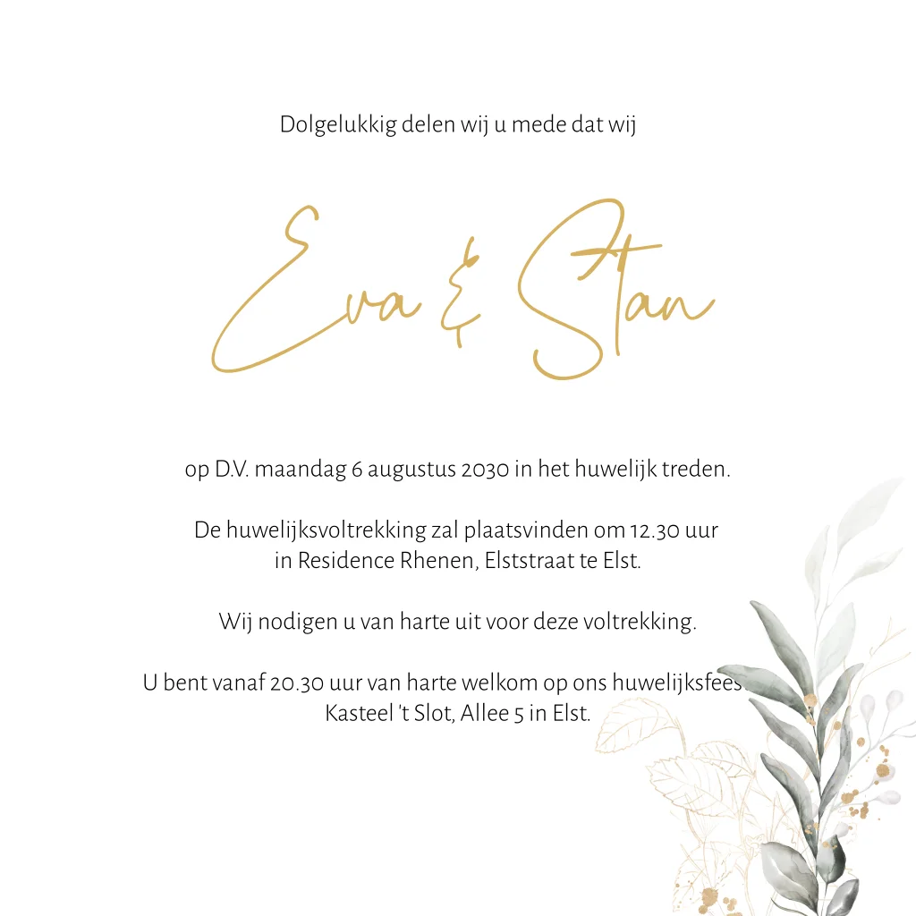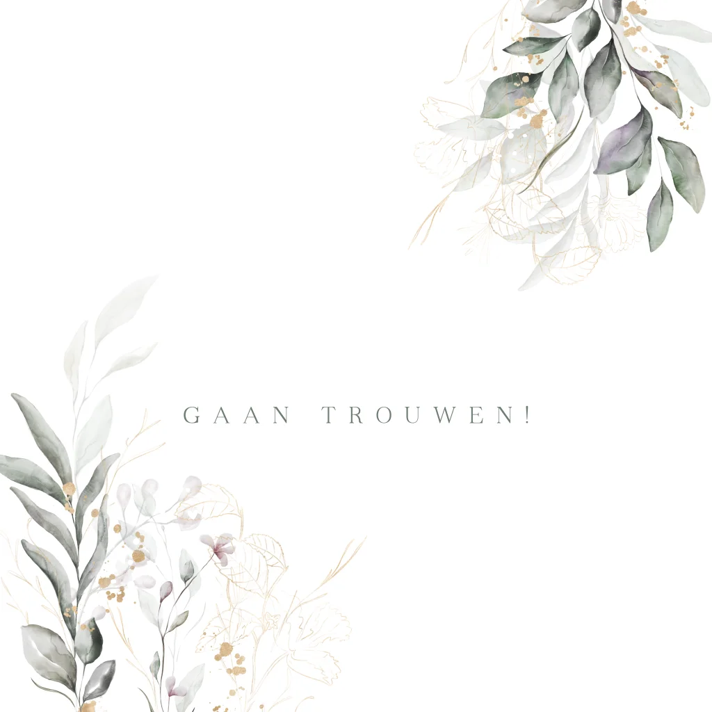 Stijlvolle trouwkaart met prachtig getekende takjes en bloemen en op de voorkant de namen in glimmende goudfolie. (22893)
