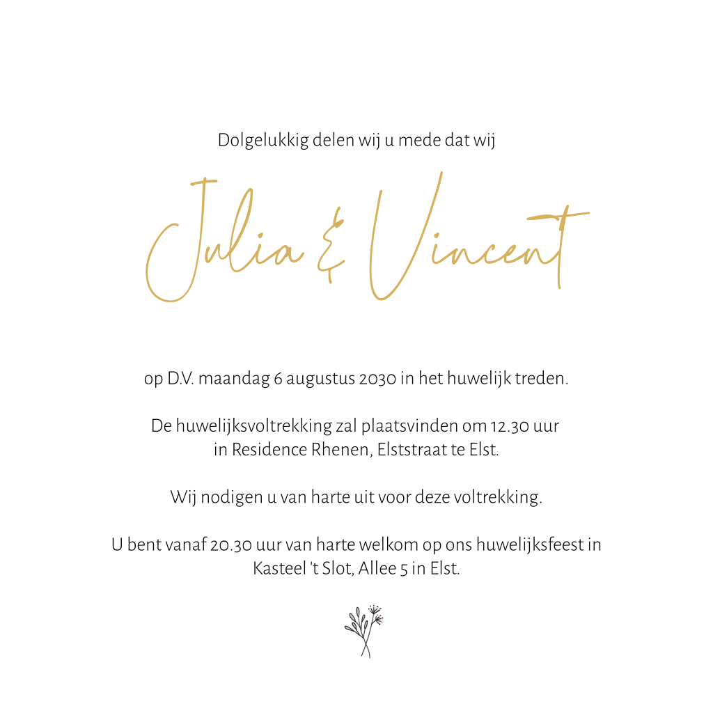 Stijlvolle trouwkaart met bruidspaar achterkant en takjes goudfolie