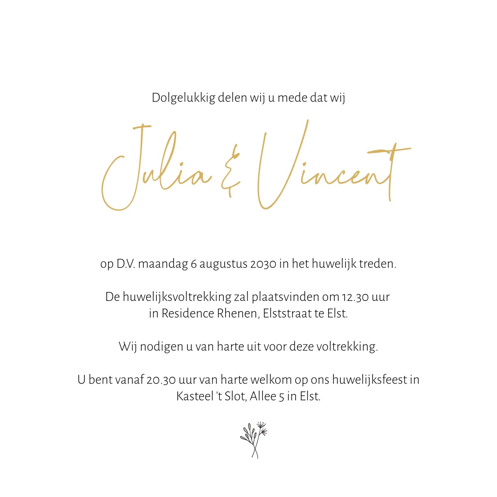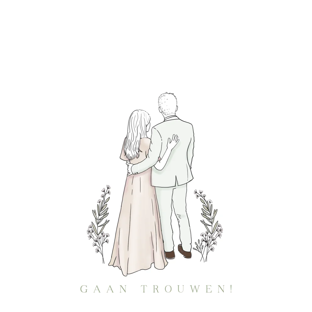 Stijlvolle trouwkaart met bruidspaar achterkant en takjes goudfolie. (22958) Willen jullie de tekening aangepast hebben zodat het meer op jullie lijkt? Vaak is dat mogelijk, neem daarvoor contact met ons op.