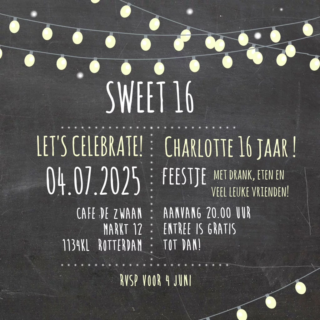 Sweet 16 uitnodiging verjaardagfeest krijtbord met slinger van lampjes vierkant. (3194)