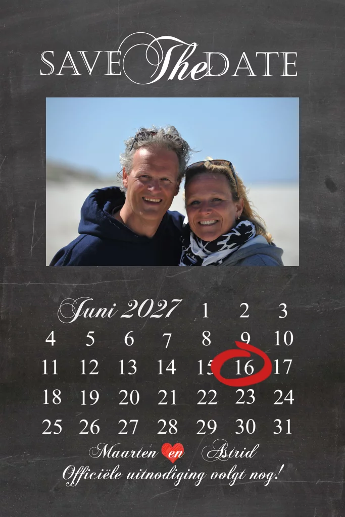 Trendy Save the Date kaart trouwen schoolbord met kalender. Trouwdatum rood omcirkeld. (1081)