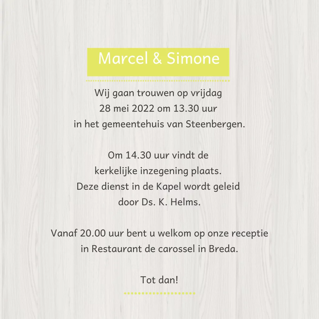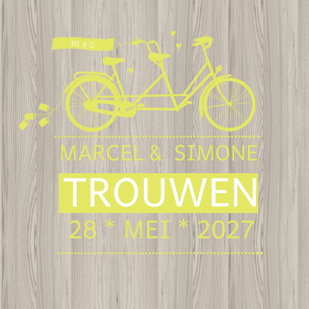 Uitnodiging bruiloft om te gaan trouwen met tandem fiets en hout structuur. Houten planken op de achtergrond. (1307)