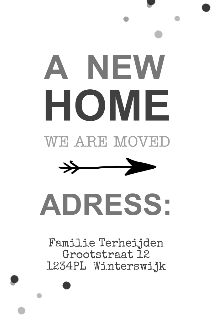 Trendy verhuiskaart in grijstinten met confetti. Witte achtergrond, kleur is naar keuze aan te passen. (2168)