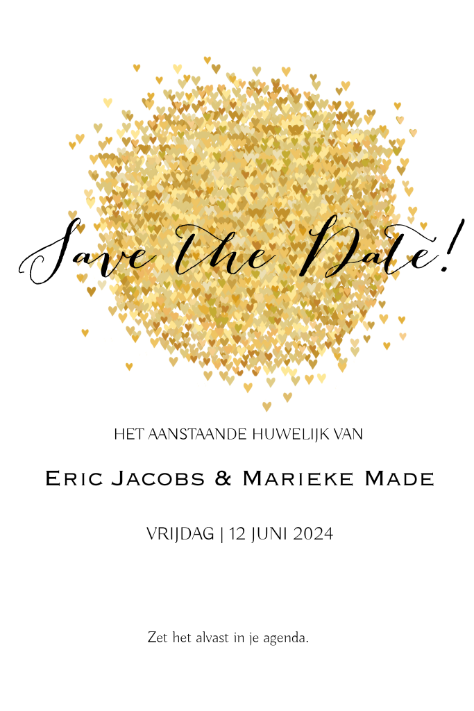 Trouwkaart cirkel met goudkleurige hartjes kleur, stijlvol en prachtige kaart. (3311)