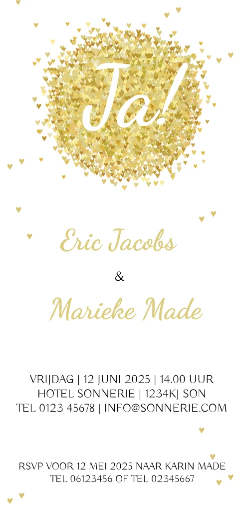 Trouwkaart cirkel met gouden hartjes in langwerpige uitvoering