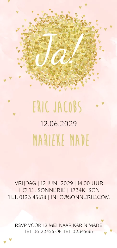 Trouwkaart roze met gouden hartjes in lange uitvoering roze