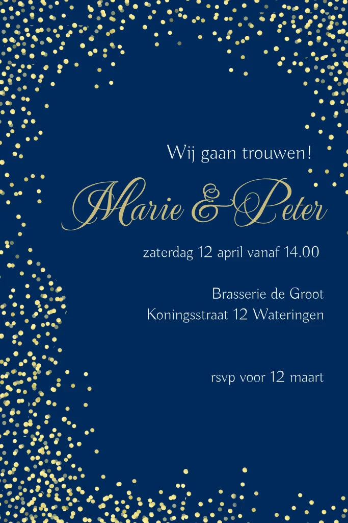 Staande trouw uitnodiging goudkleurige tinten confetti met wisselbare achtergrond. (4195)