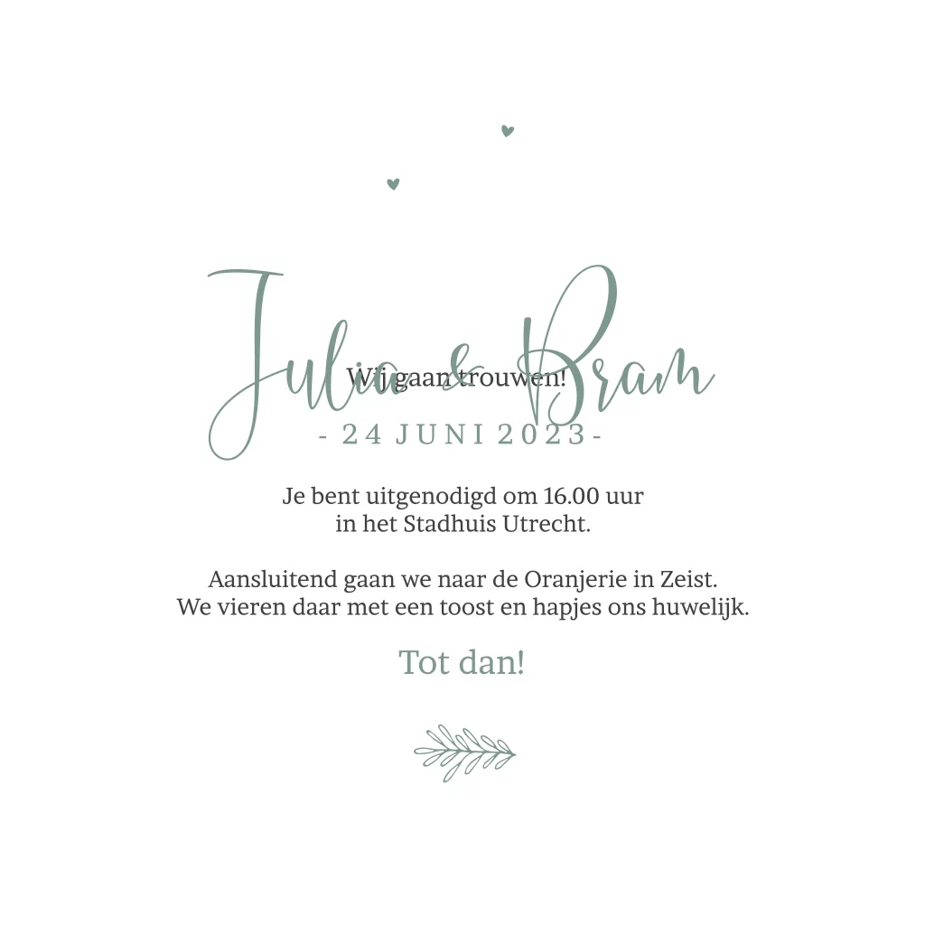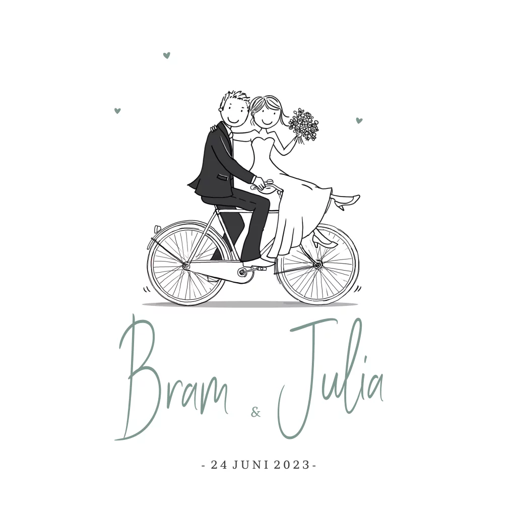 Trouwkaart bruidspaar op fiets met groene letters