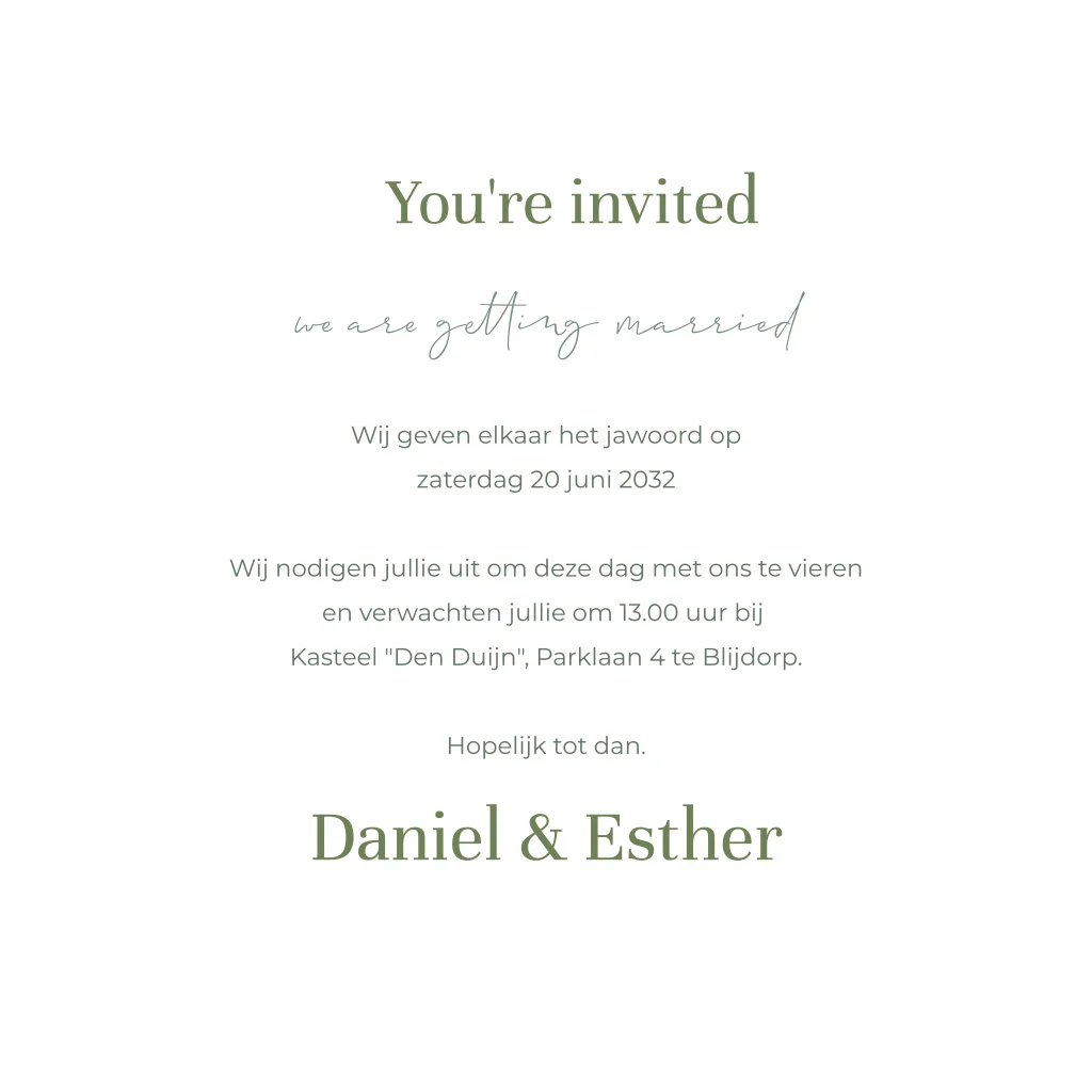 Stijlvolle trouwkaart wit van kleur met vele groene takjes met bladeren met goudlook. (24440)