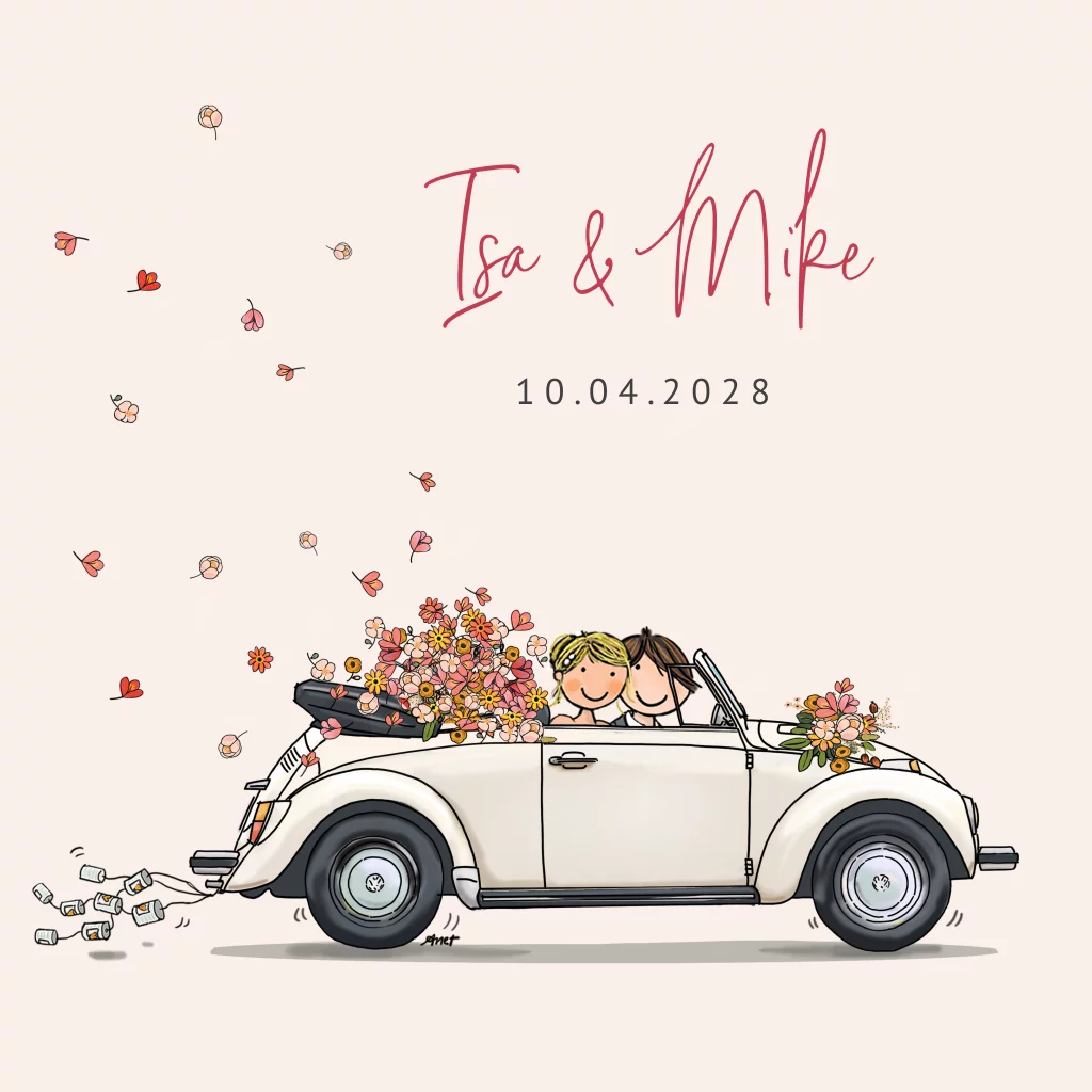 Trouwkaart met mooi getekende Volkswagen Kever Beetle trouwauto met erin het bruidspaar en bloemen. (20958)