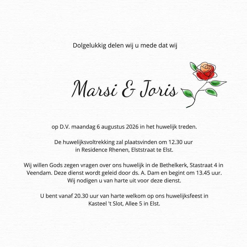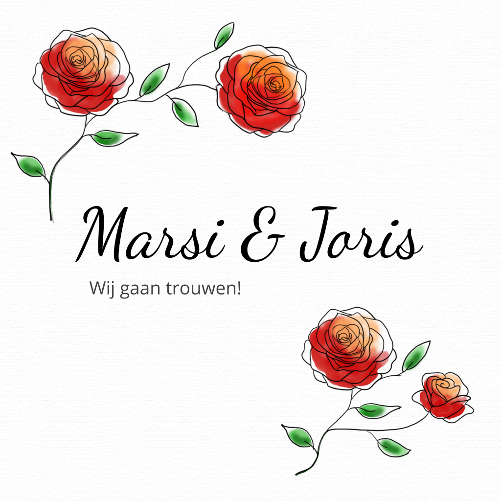 Bijzondere trouwkaart met rode rozen in waterverf, stijlvol en klassiek in vierkant. (2955)