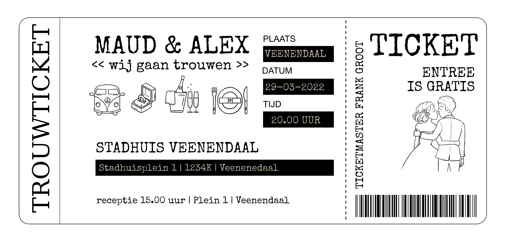 Trouwkaart ticket lang wit met illustraties icoontjes