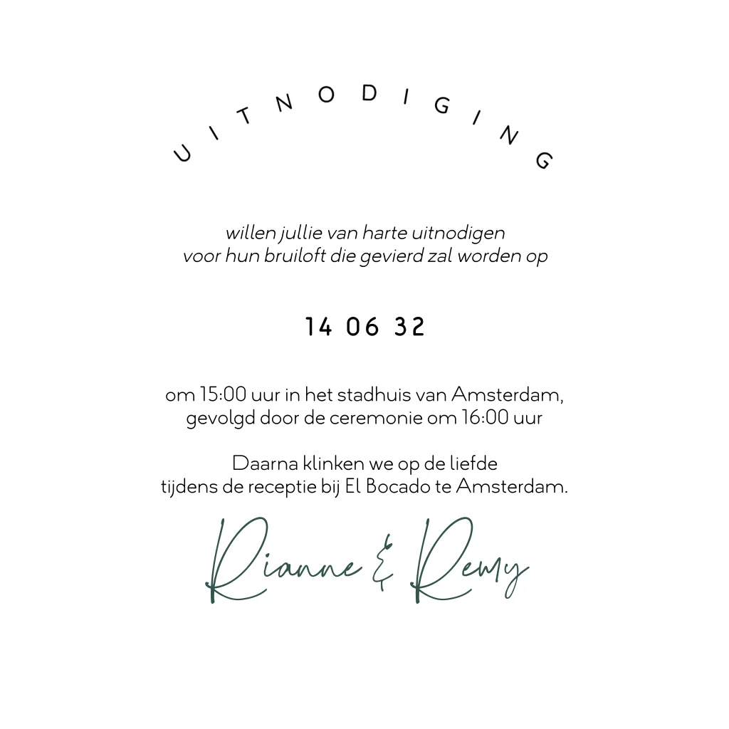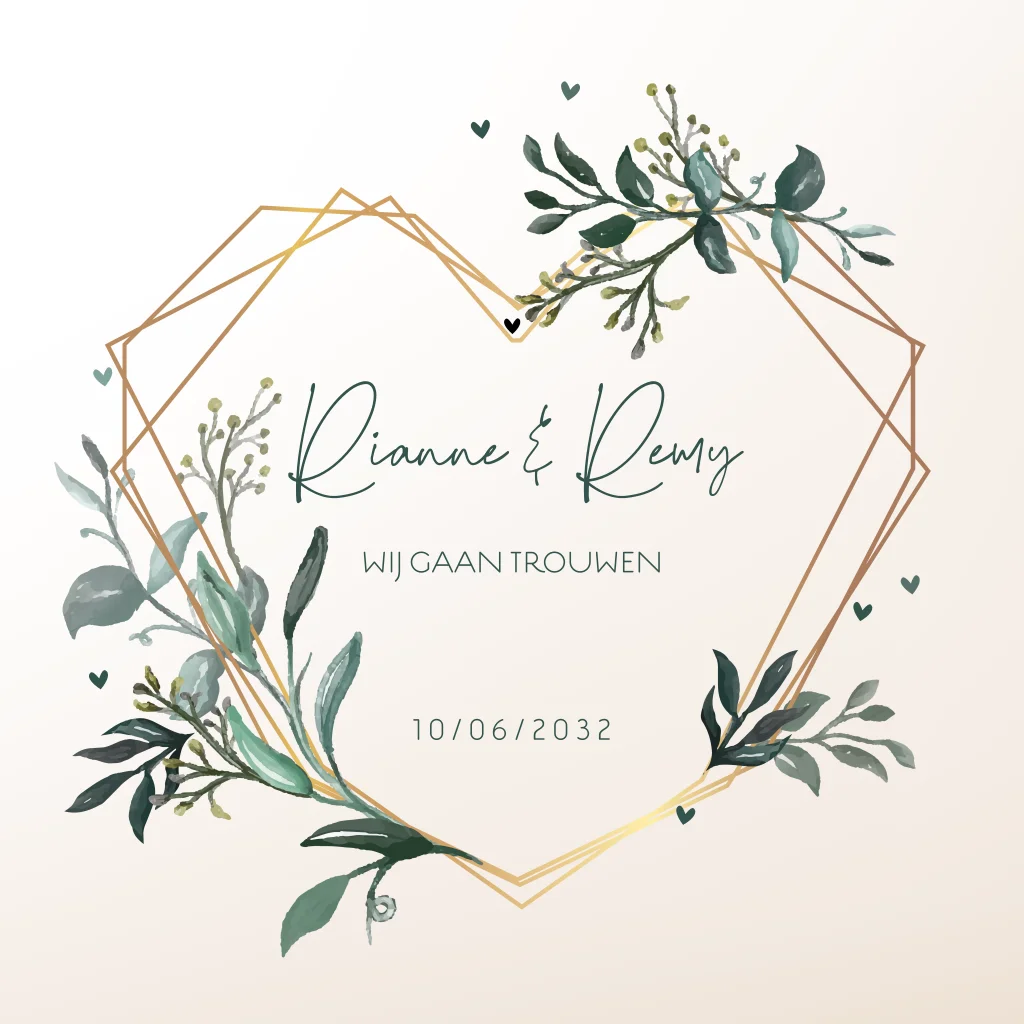 Trouwkaart met een groot geometrische goud-look hart met kleine hartjes en groene takjes met bladeren. (30341)