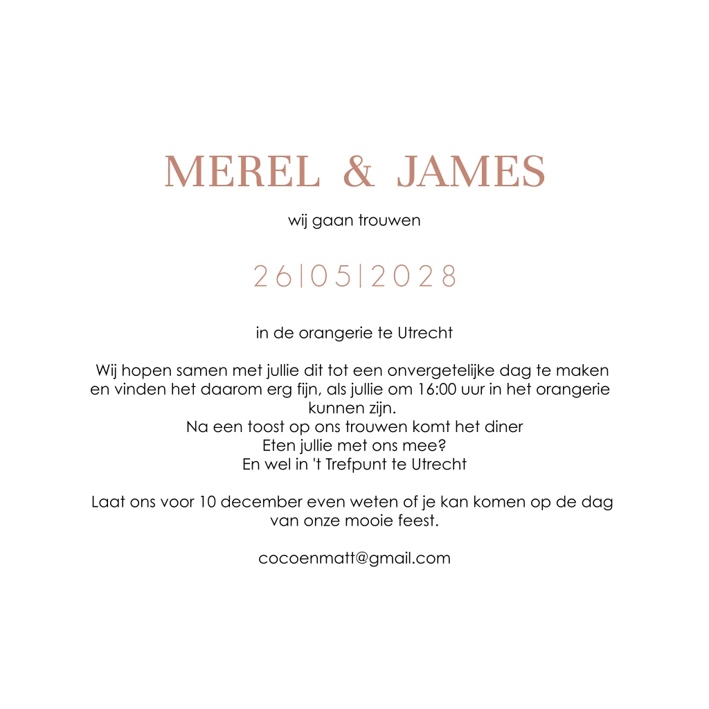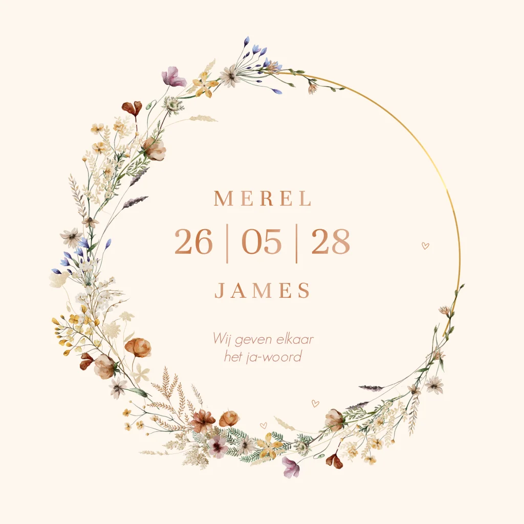 Trouwkaart met een krans van verschillende bloemen op beige achtergrond en mooie typografie. (30340) Op de voorkant de namen en datum in mooi glimmende hoogglans uv spot lak gedrukt.