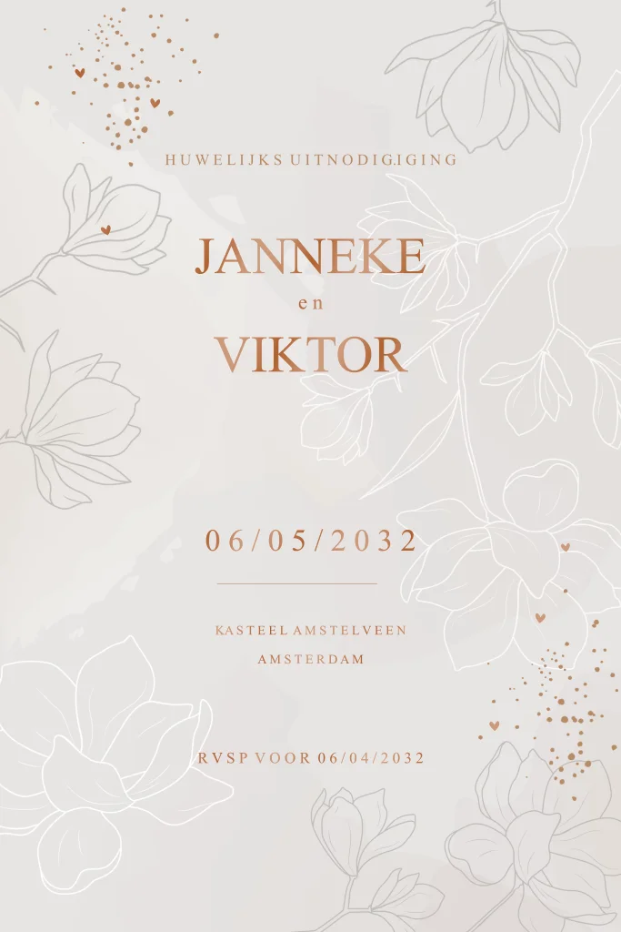 Trouwkaart in aardetinten beige, oud-roze met gestileerde bloemen en een mooie hoogglans afwerking op de voorkant (30329)