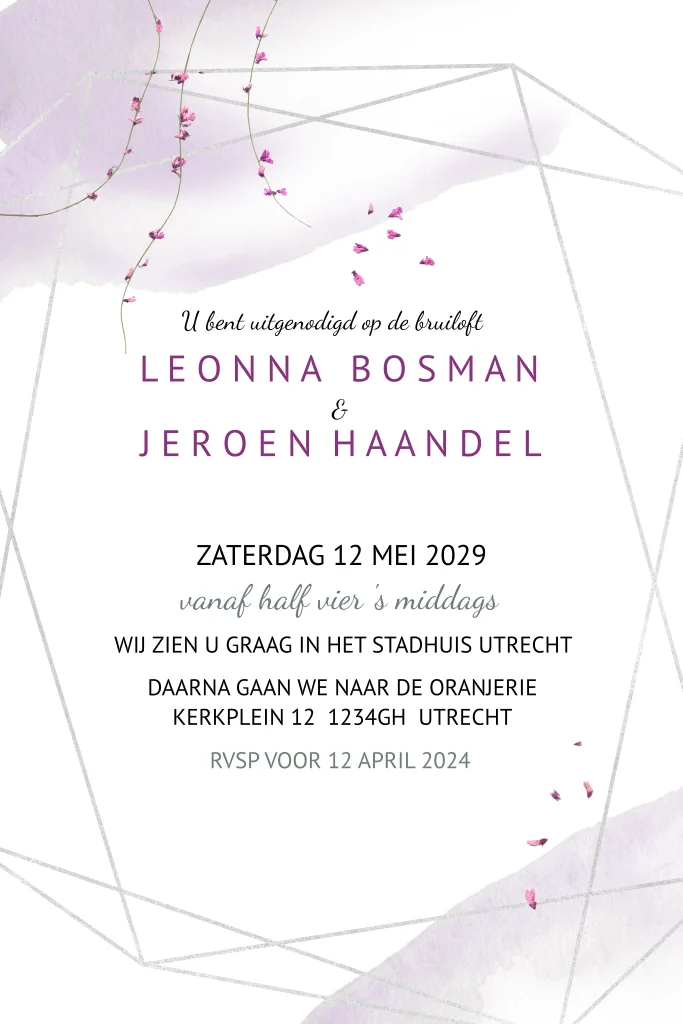Trouwkaart waterverf paars met mooie takjes