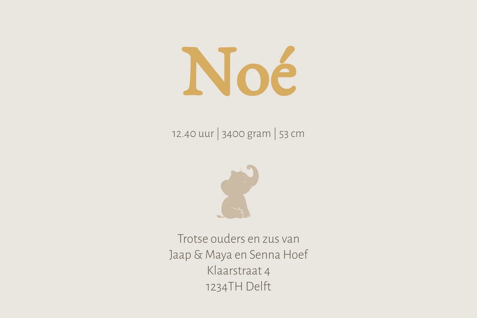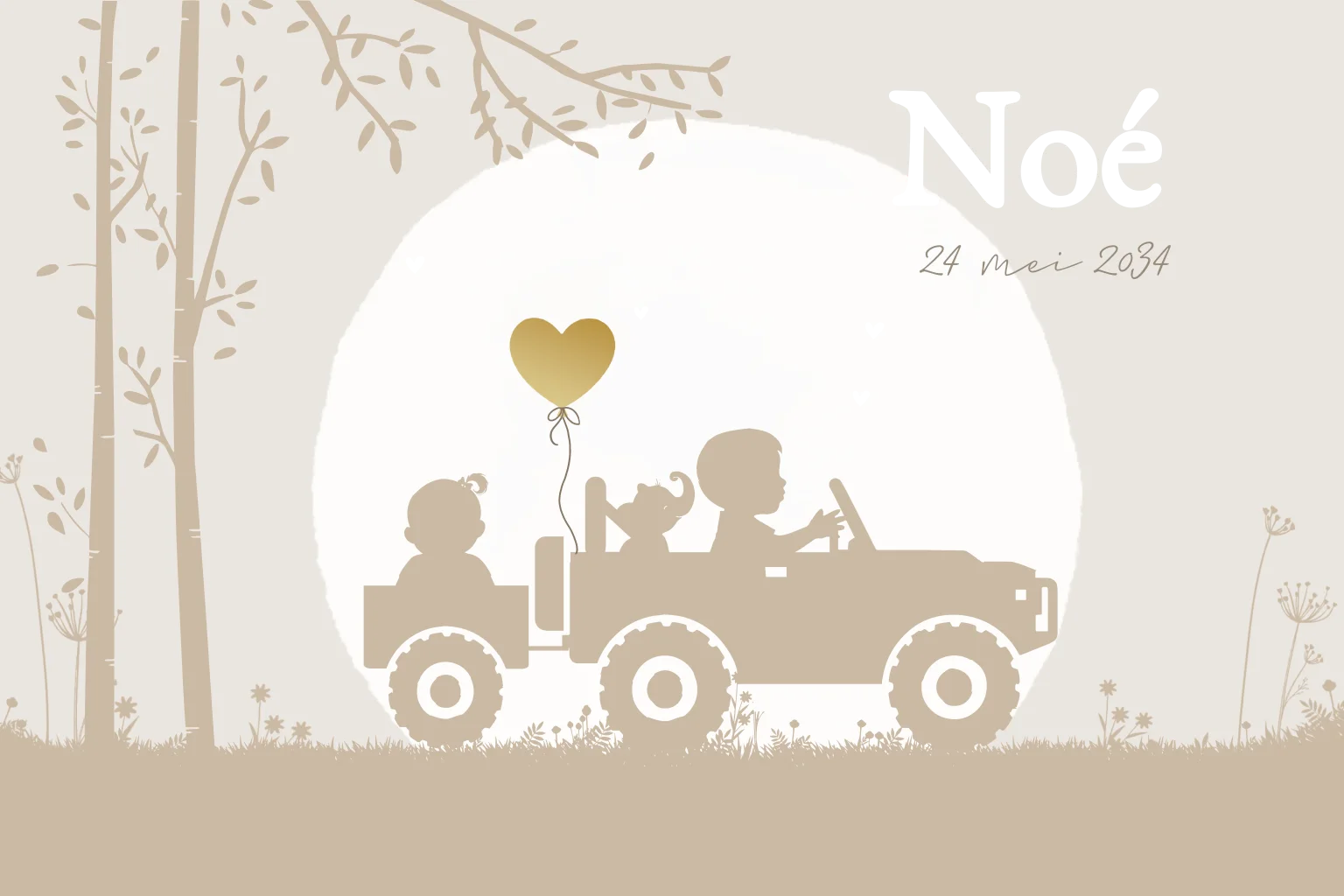 Stoer geboortekaartje tweede kindje met grote broer in een auto landrover jeep met de baby in de aanhanger. De kaart is beige creme van kleur en geeft goudfolie afwerking voor een extra hippe uitstraling op het kaartje. (30367)