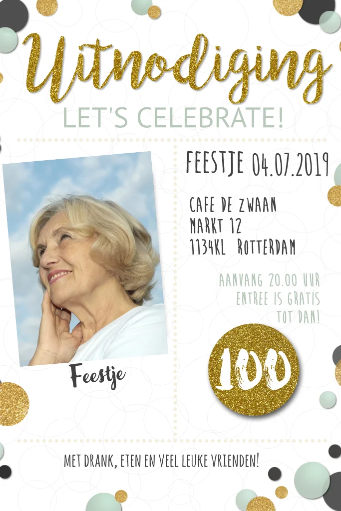 Uitnodiging feestje 100 jaar met confetti in wit enkel. (6337)