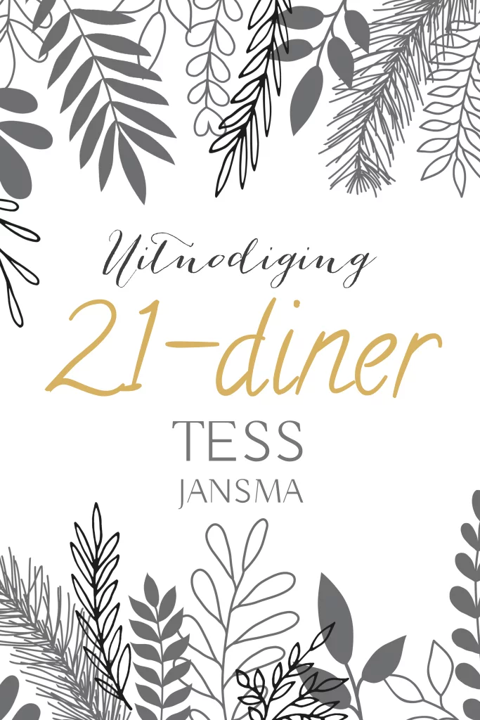 Hippe uitnodiging 21 diner met bladeren witte kaart 70. (7555)