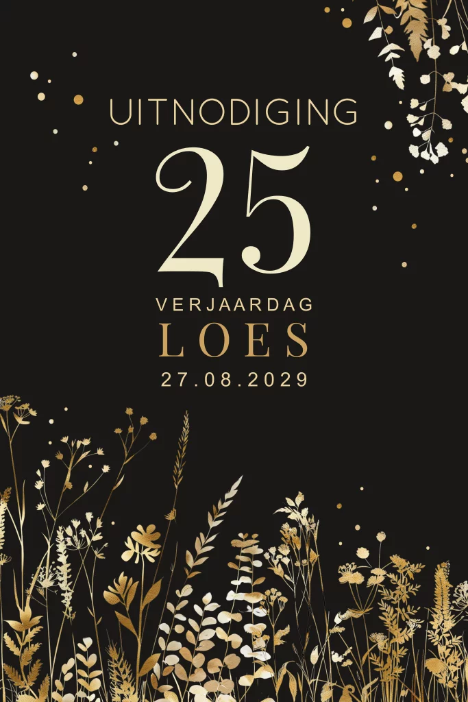 Uitnodiging 25ste verjaardag feestelijk met goudlook takjes