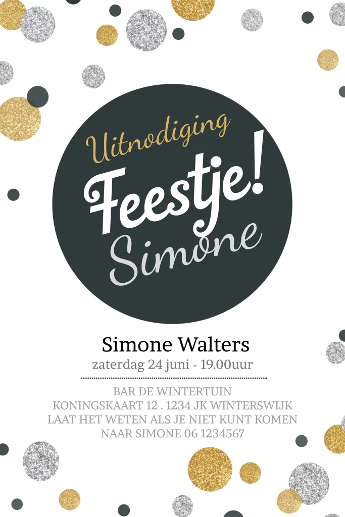 Uitnodiging feestje met confetti in zilver en goudlook, teksten zijn geheel aanpasbaar. (5300) Kaartje heeft nu ronde hoeken maar dit kan ook recht