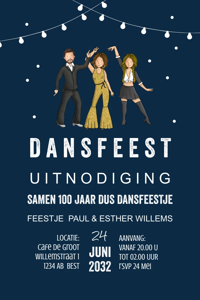 Uitnodiging dance party met lampjes en goudfolie