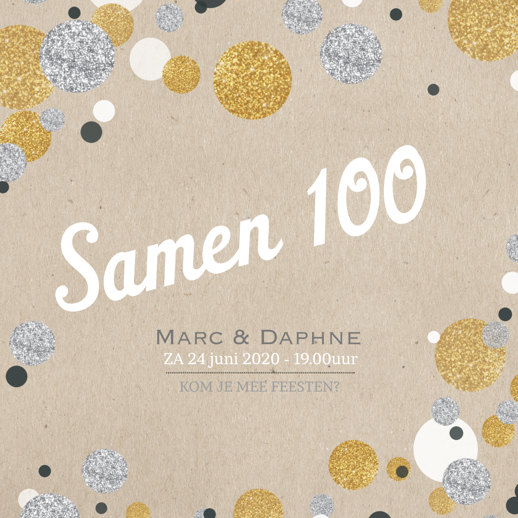 Uitnodiging samen 100 jaar dubbel met confetti in zilver en goudlook