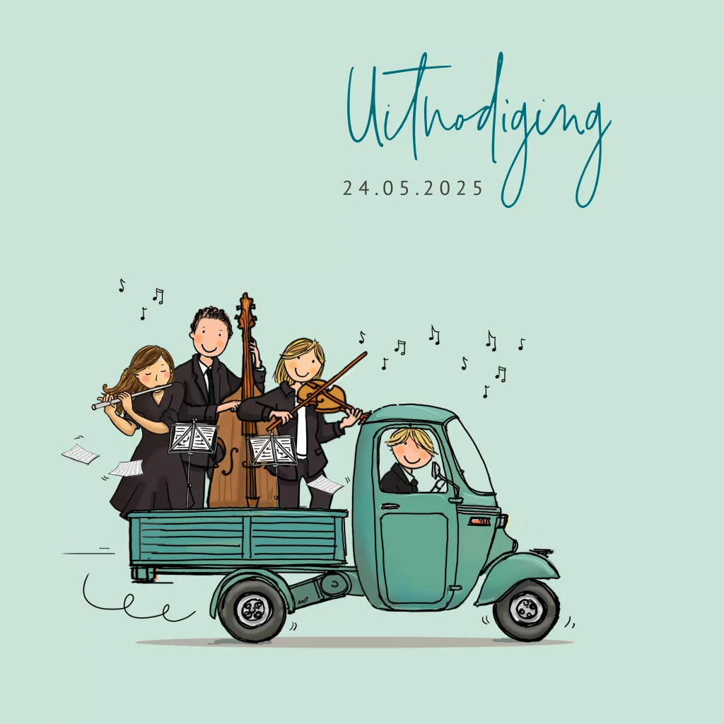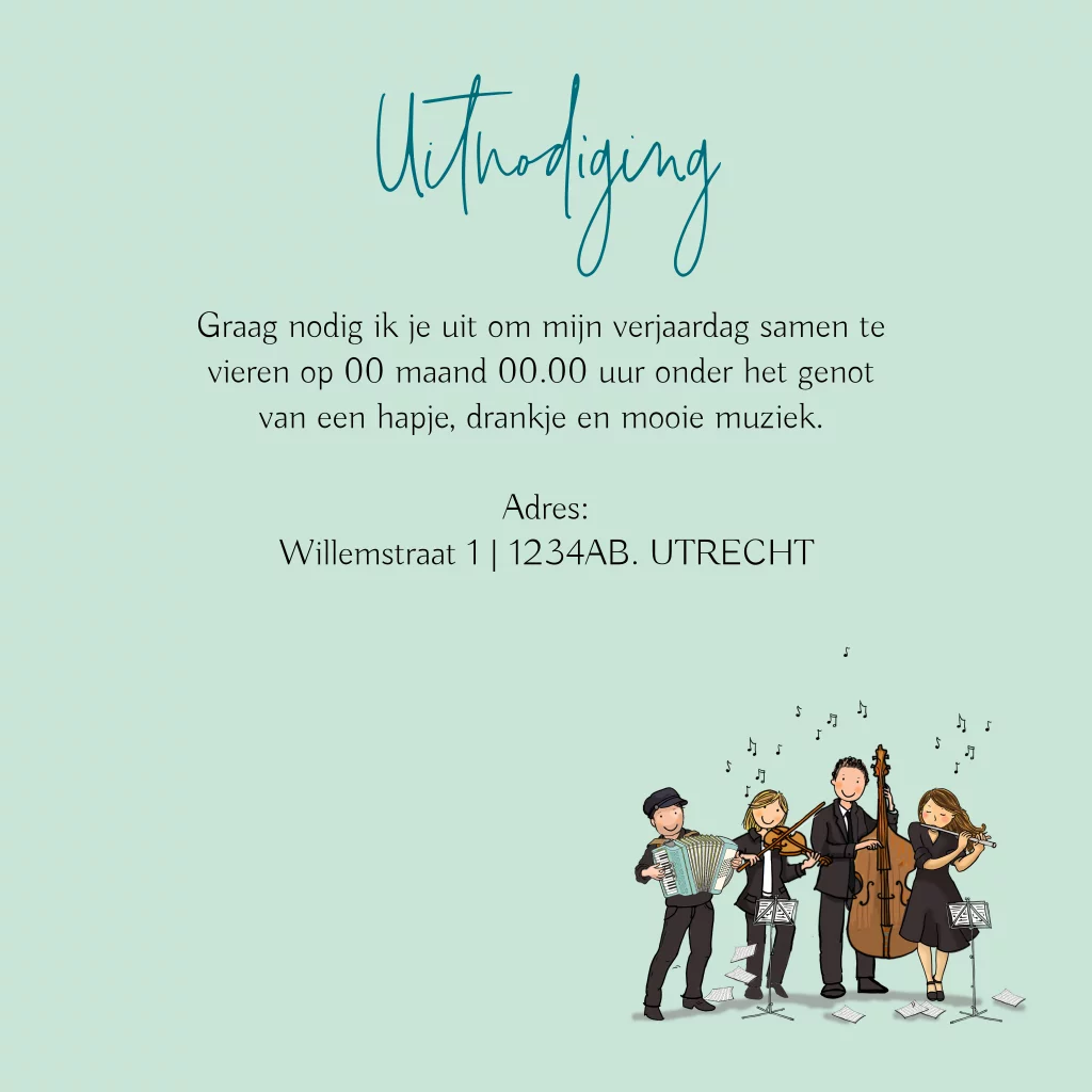 Uitnodiging voor een feestje in muziek thema met onder andere een klassiek orkest in de laadbak van een groene Vespa Ape. De groene achtergrond kan naar wens worden aangepast. (20965)