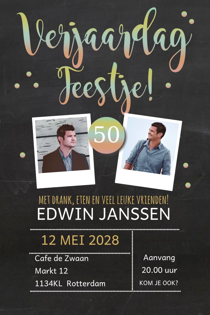 Uitnodiging feestje 50 jaar kleurde letters