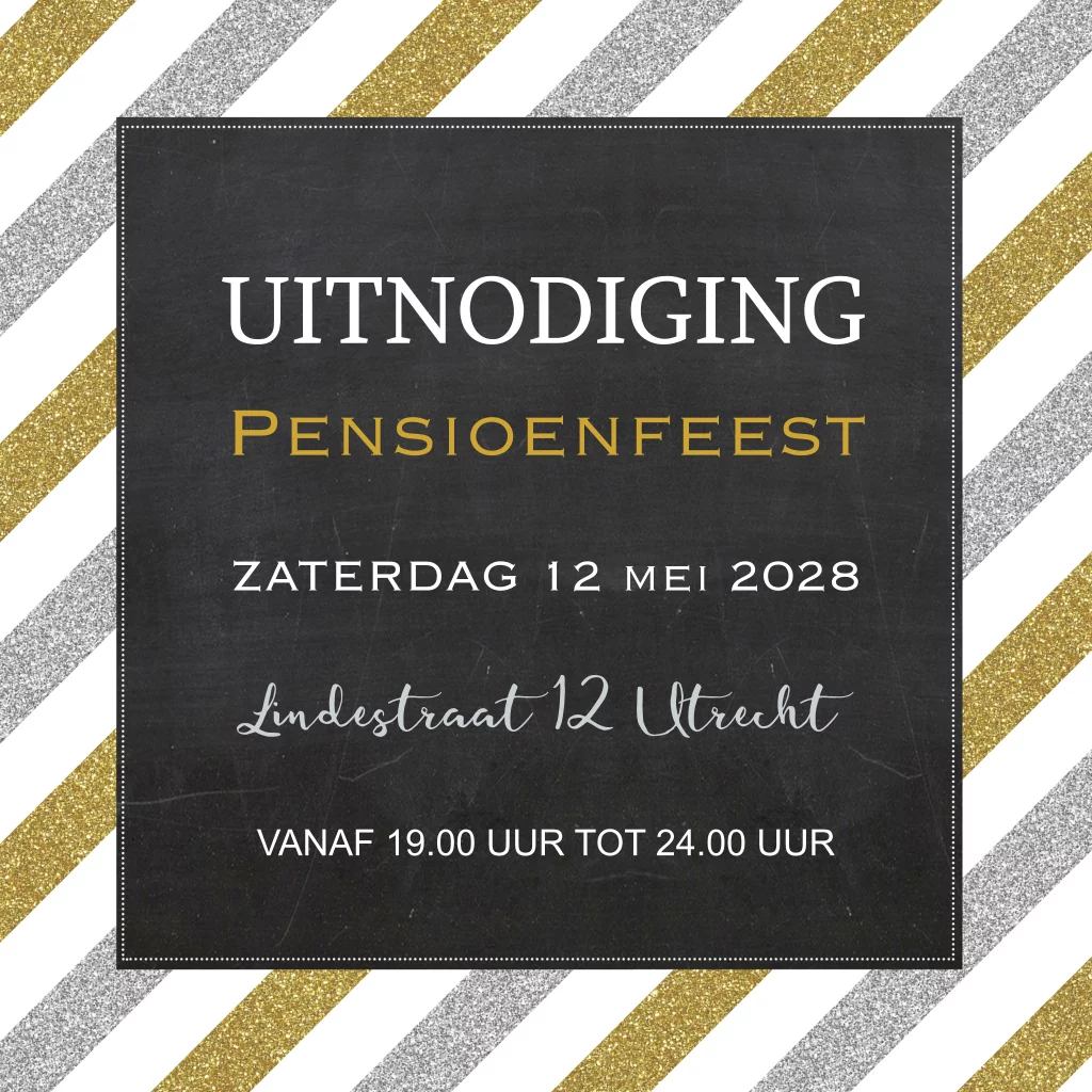 Pensioenfeest uitnodiging met goud look en zilver look streep en krijtbord. (6341)