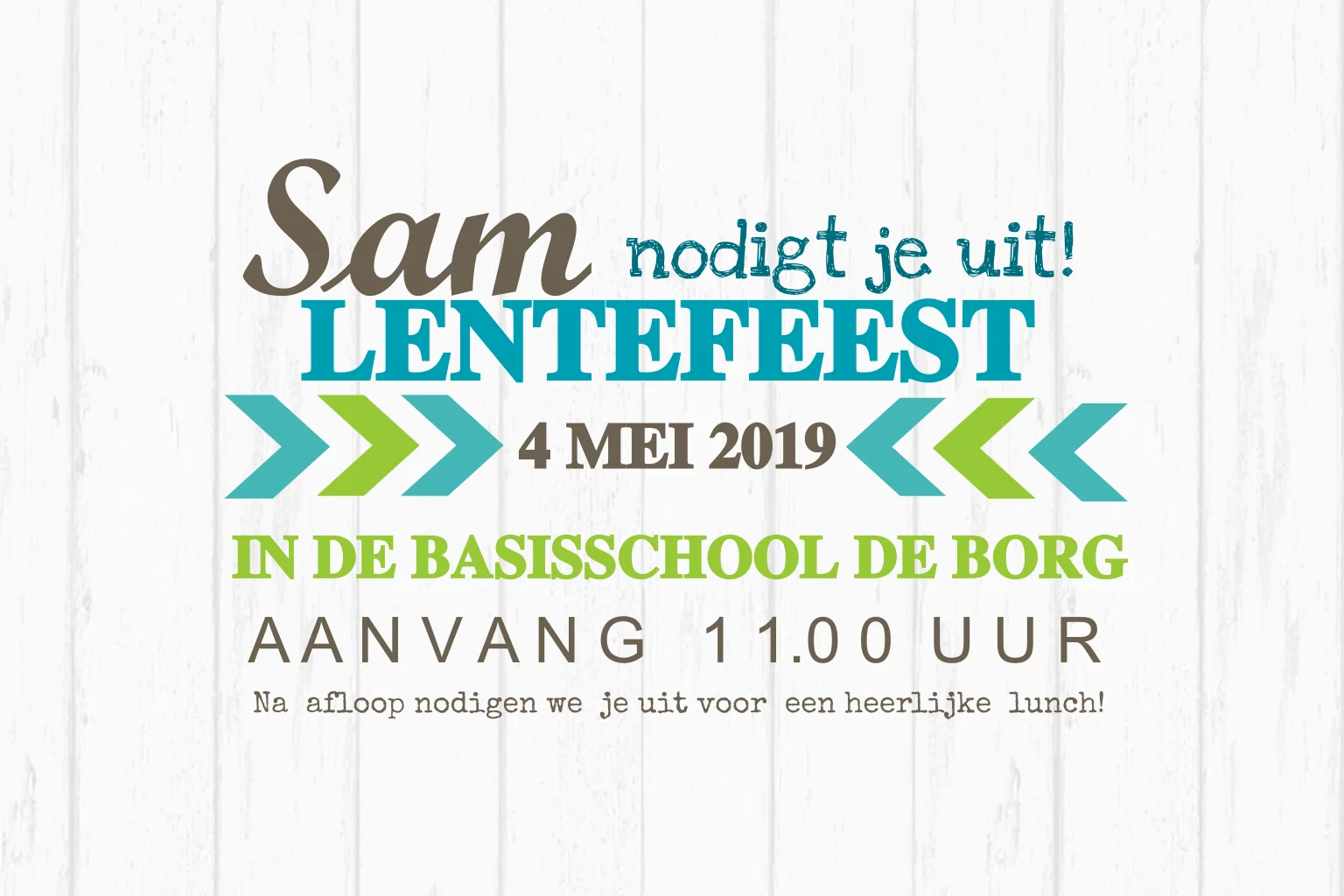 Uitnodiging Lentefeest jongen typografie en hout. Groen en blauw. (1442)