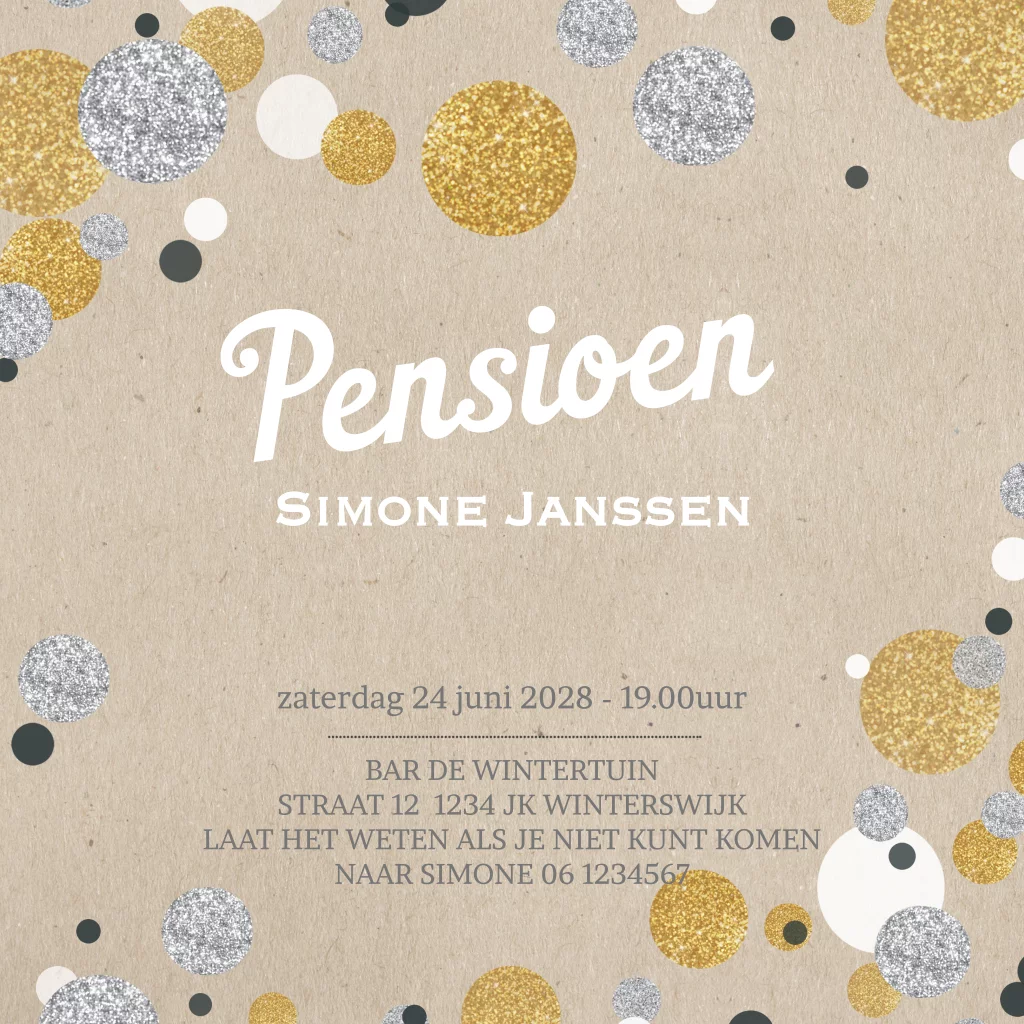 Uitnodiging pensioen feest met confetti in zilver en goudlook en kraft, teksten zijn geheel aanpasbaar. (5296)