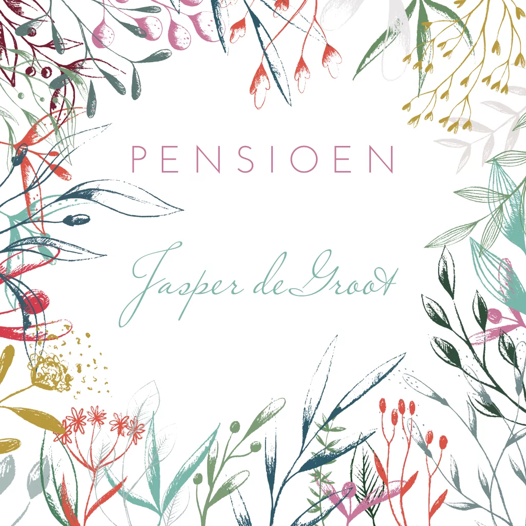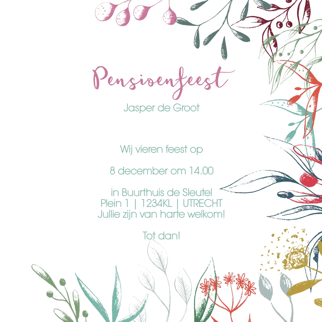 Pensioenfeest uitnodiging met takjes in verschillende kleuren. (7627)