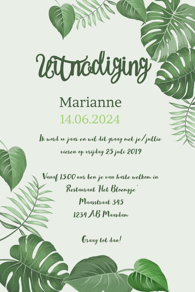 Mooie verjaardagsuitnodiging kaart met groene bladeren en aanpasbare teksten. (4425)