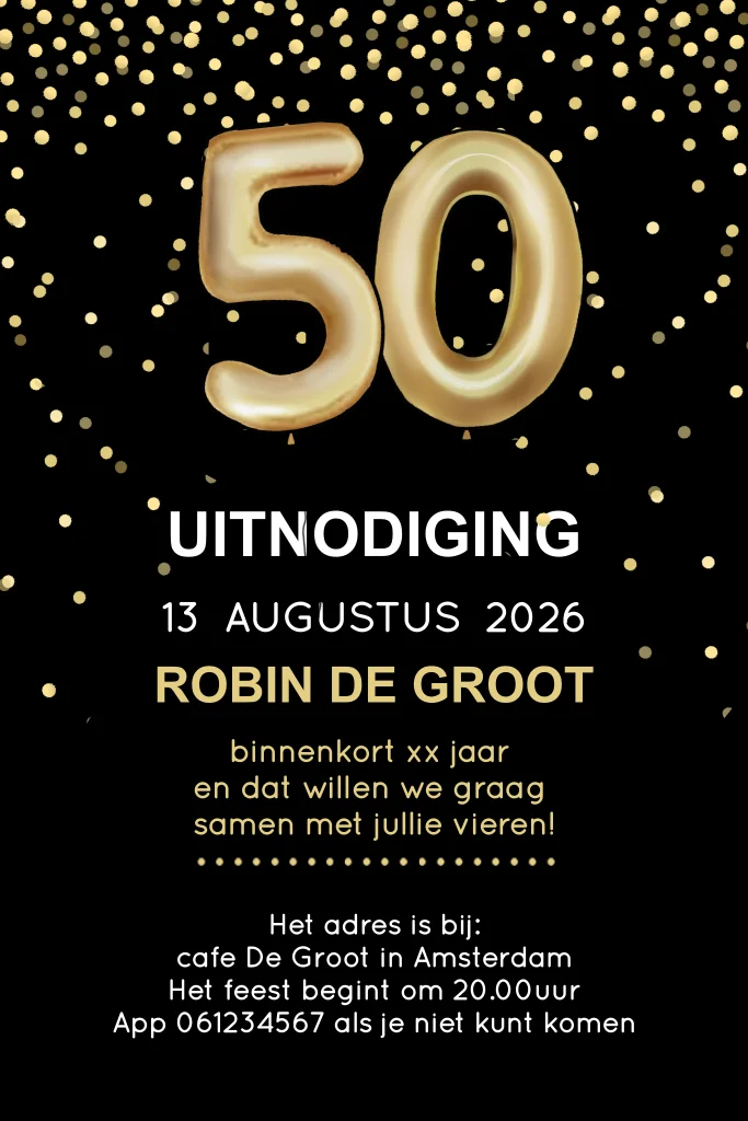 Uitnodiging voor een verjaardag met goudlook confetti ballon 50 jaar man of vrouw (30416)