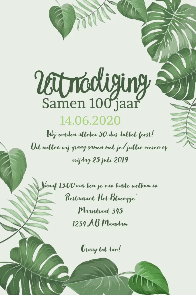 Uitnodigingskaart verjaardag samen 100 met groene bladeren
