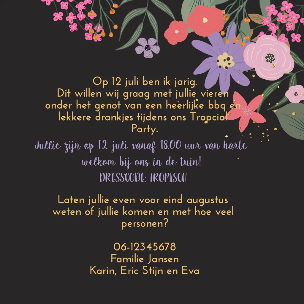 Uitnodiging feestje verjaardag met vrolijke bloemen en glitters. (23637)