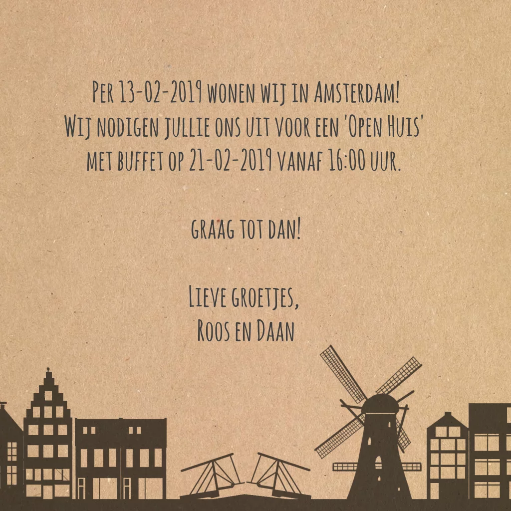 Verhuiskaarten met hollandse rij huisjes op karton. Met karakteristieke grachten panden en molen uit nederland. (2115)