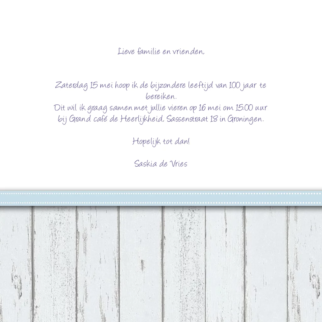 Verjaardagskaart voor 100ste verjaardag. Kaart met witte rozen en hout. Blauw lint met taupe label. (355)