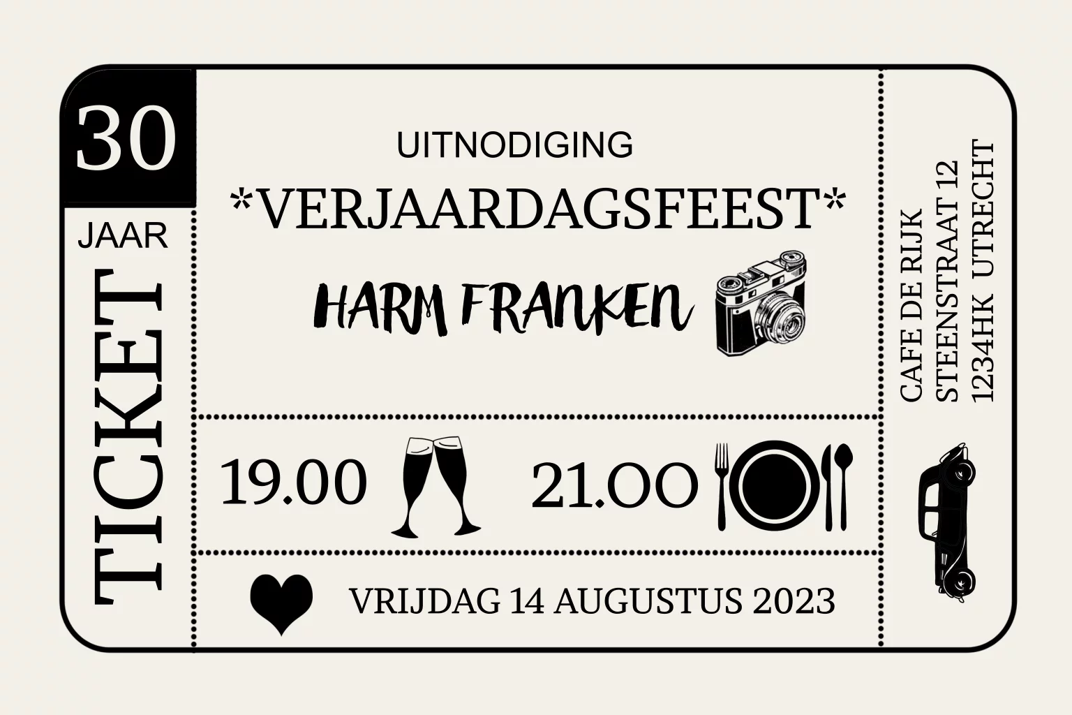 Stoere en originele ticketkaart 30 jaar verjaardag met geheel aanpasbare tekst en achtergrond. (3198)