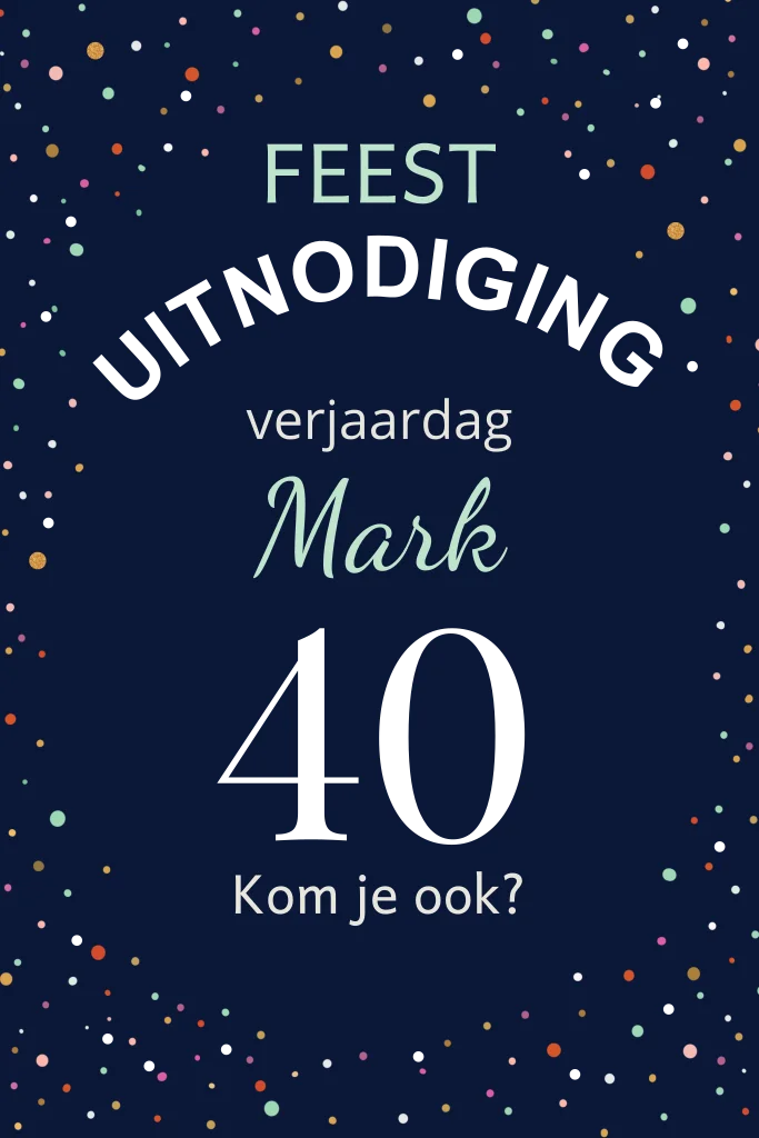 Staande enkele uitnodigingskaart voor een feestje met gekleurde confetti en goudfolie 40 jaar (30179)