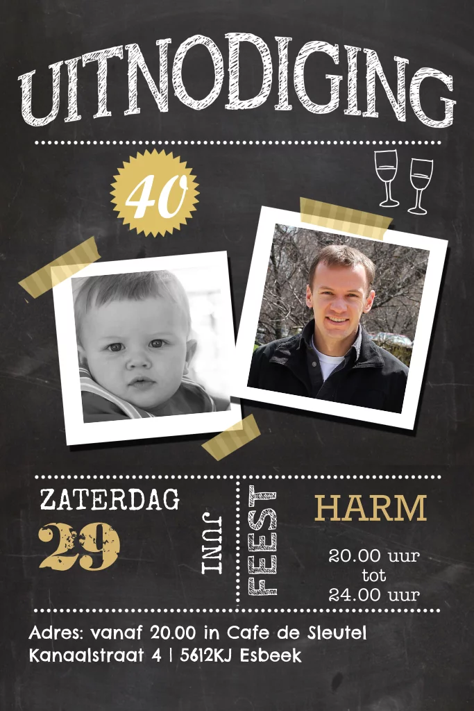 Verjaardag 40 jaar uitnodiging krijtbord met typografie en fotos